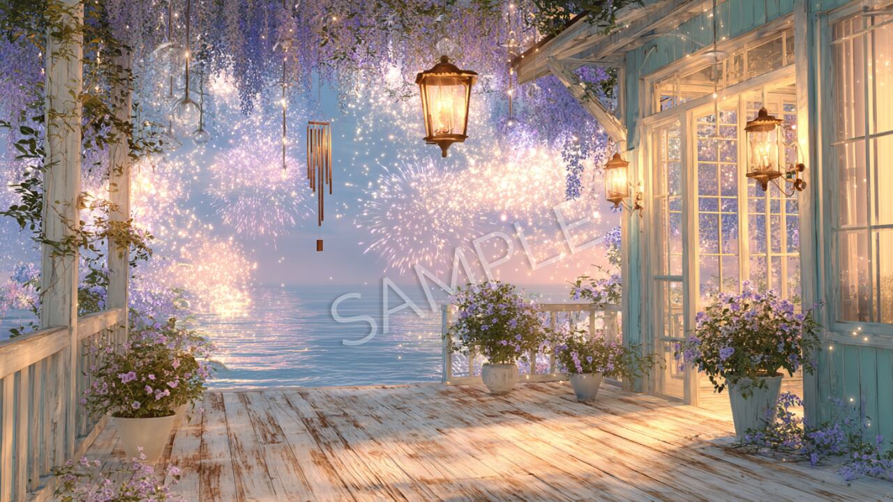 心躍る海辺の花火があなたのオンライン空間を鮮やかに彩るZoom背景&PC壁紙です。